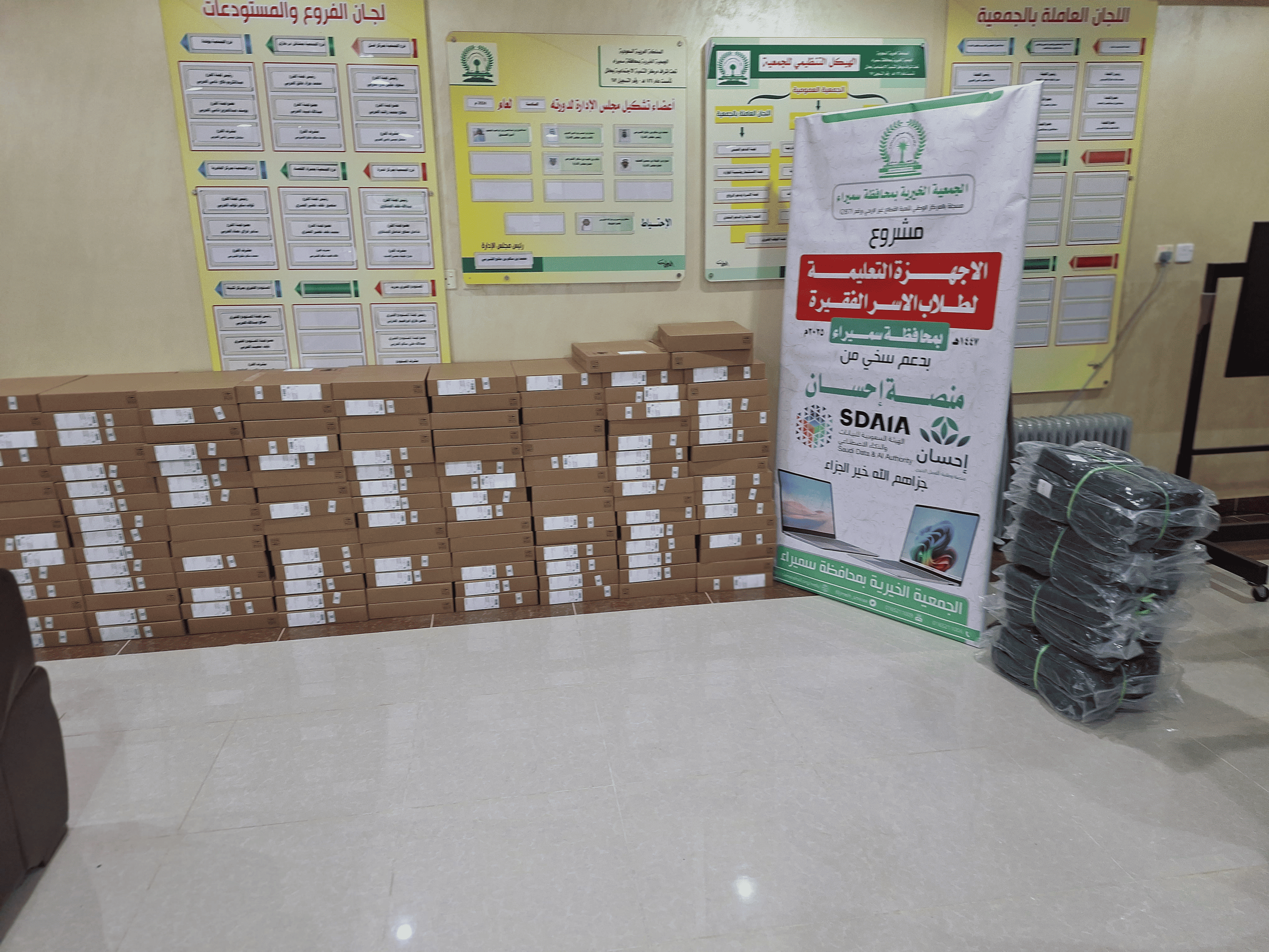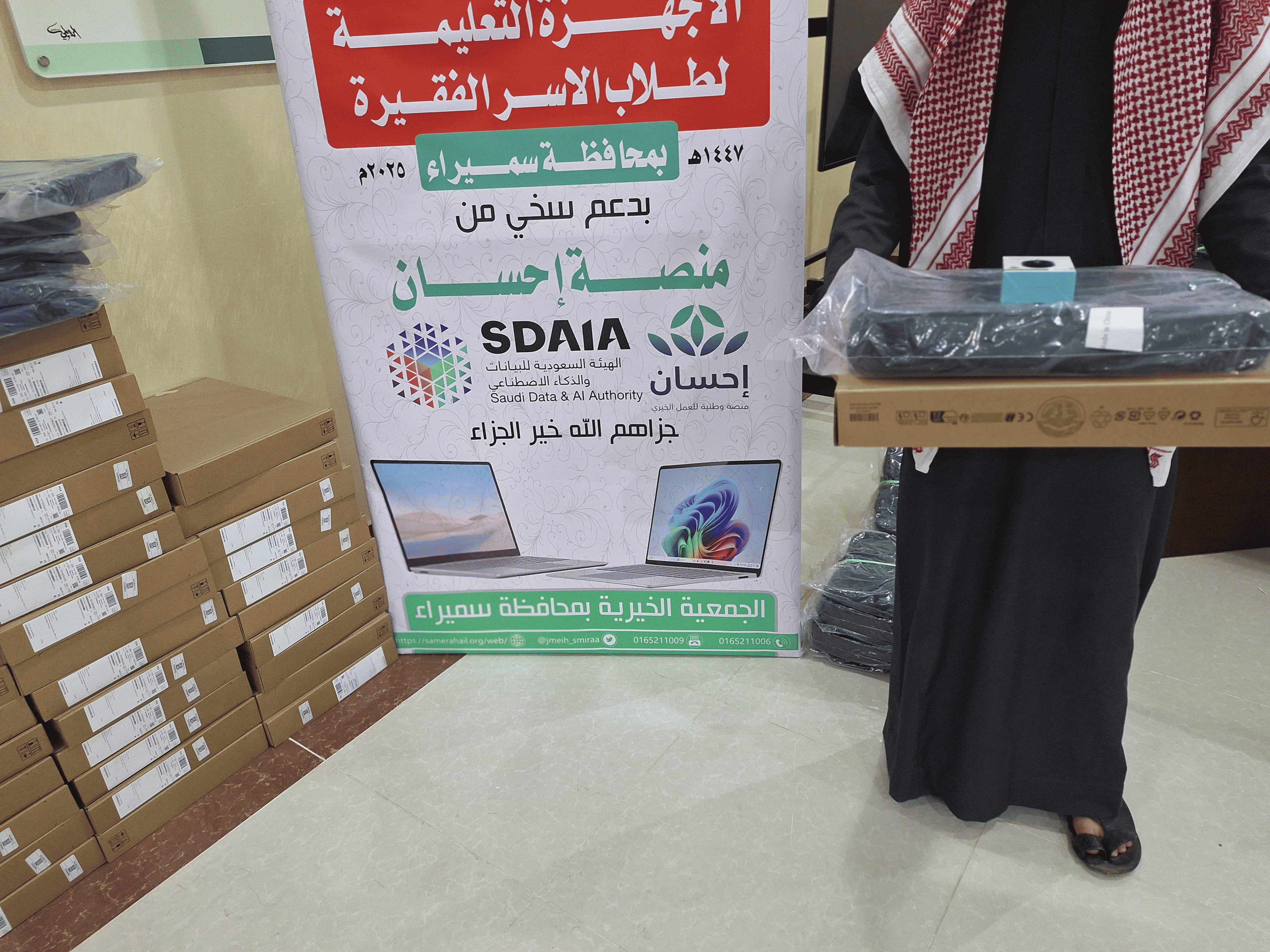 قامت الجمعية الخيرية بمحافظة سميراء بتوزيع اجهزة حاسب الي محمول لطلاب الاسر المحتاجة في المرحلة الجامعية والثانوية والمتوسطة وذلك من خلال الدعم الواصل من منصة احسان لتوفير الاجهزة التعليمية لطلاب الاسر المحتاجة والبالغ قيمته٤٢٣٥٠٠ ريال سعودي .