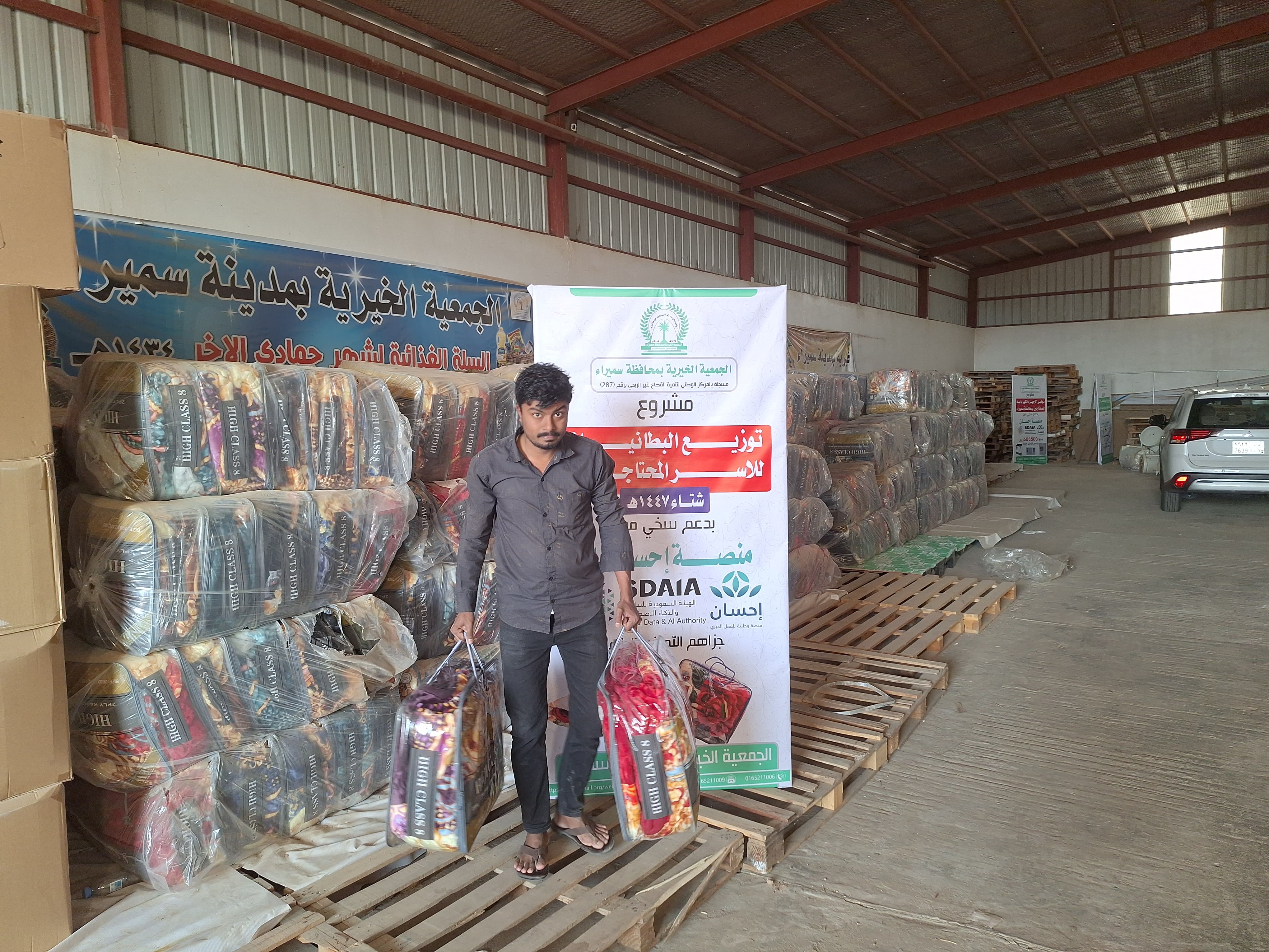 قامت الجمعية بتوزيع البطانيات للاسر المحتاجة بمحافظة سميراء وذلك من خلال الدعم الواصل للجمعية من منصة احسان والبالغ قيمته 180.000 ريال